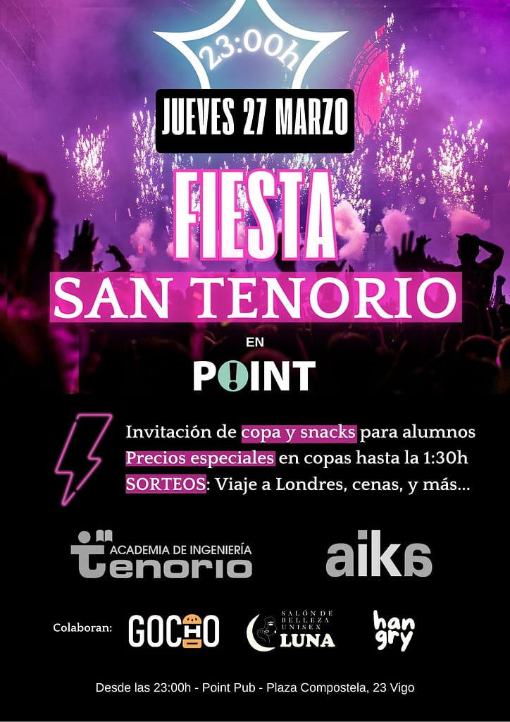 ¡El próximo jueves 27 de marzo (viernes festivo en Vigo) celebramos la fiesta “SAN TENORIO” y estáis invitados! Con copa y snacks gratis para alumnos, sorteos increíbles y muchas más sorpresas.